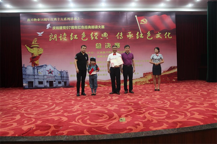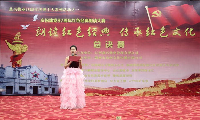2018年9月1日晚上,“朗讀紅色經(jīng)典 傳承紅色文化”江西燕興物業(yè)管理有限公司慶祝建黨97周年紅色經(jīng)典朗讀大賽總決賽,在贛南賓館會堂隆重舉行,12個紅色經(jīng)典節(jié)目從50個預(yù)賽節(jié)目中脫穎而出,同臺競技,角逐總決賽各獎項。江西省廣電網(wǎng)絡(luò)公司贛州分公司黨委委員、工會主席彭光華,贛州市明成國際旅行社總經(jīng)理羅成等領(lǐng)導嘉賓蒞臨指導,燕興物業(yè)董事長劉燕,總經(jīng)理劉南斗,副董事長陽敏,副總經(jīng)理徐桂香、張衛(wèi)東等公司領(lǐng)導,以及公司員工、小區(qū)業(yè)主等200余人在場觀看。